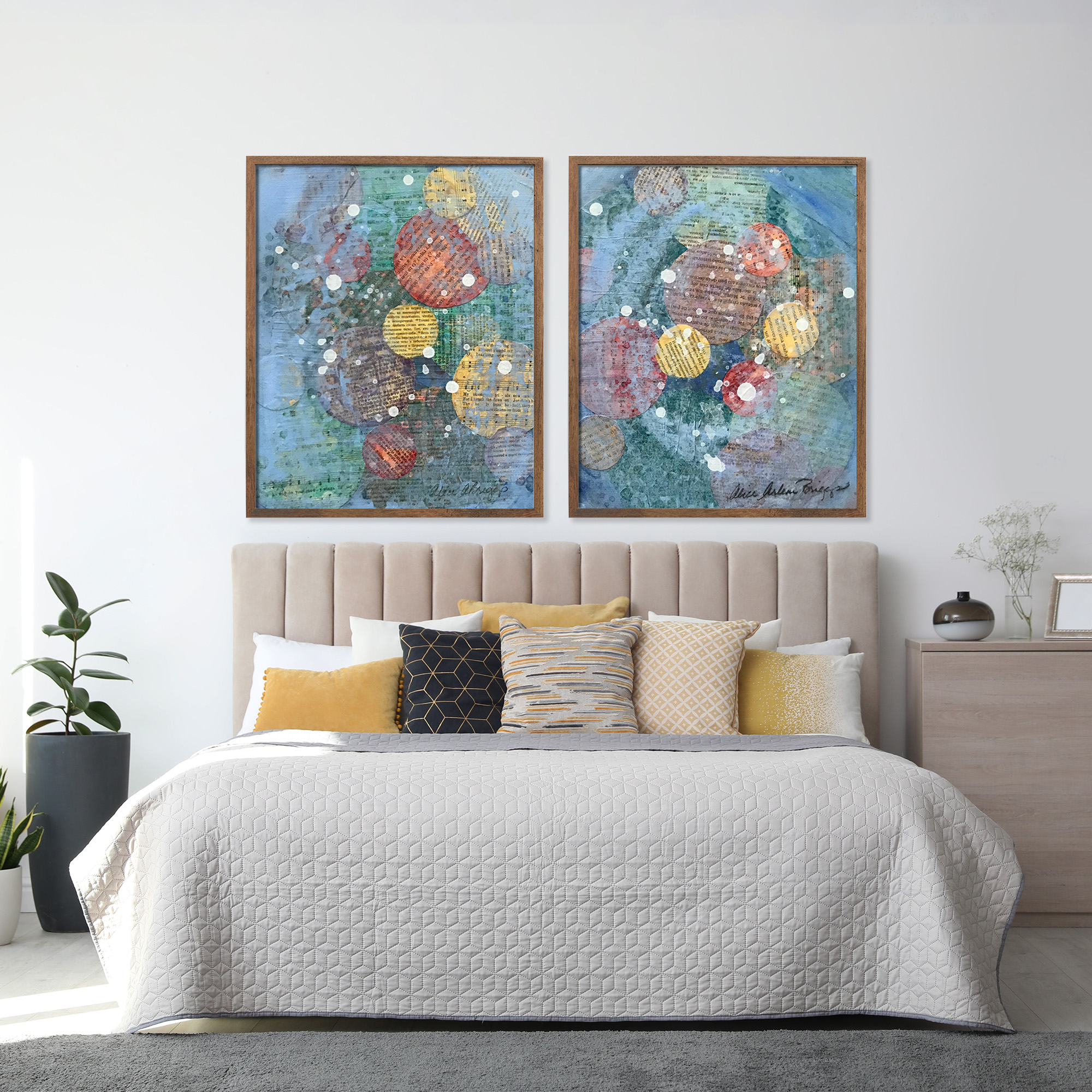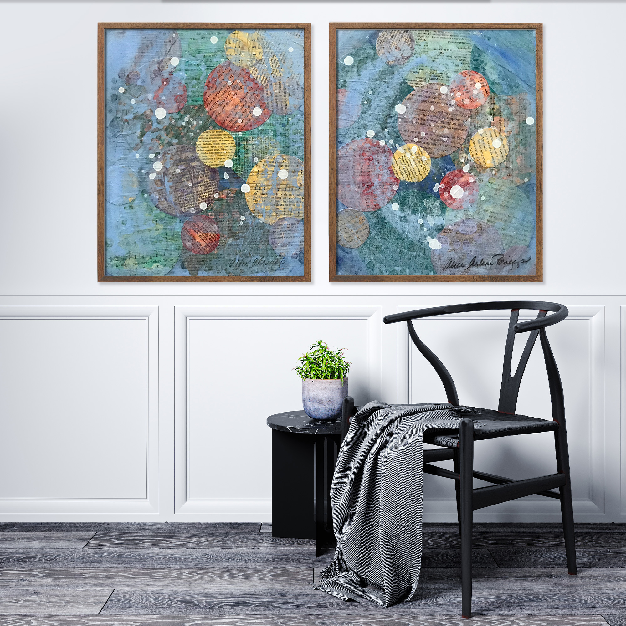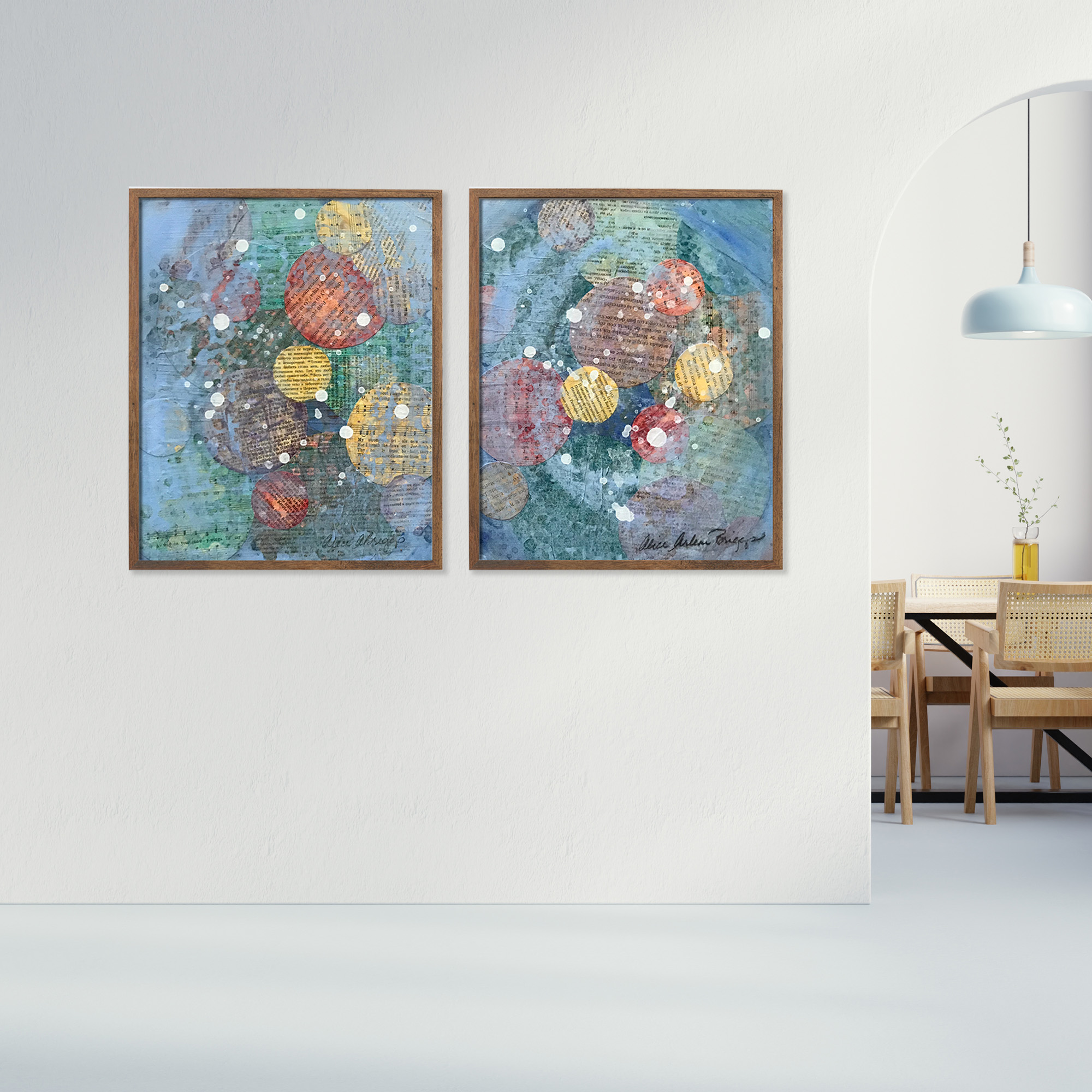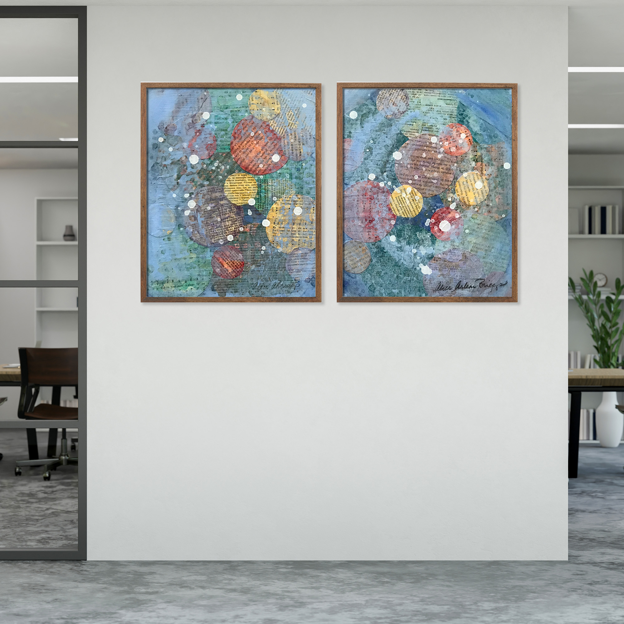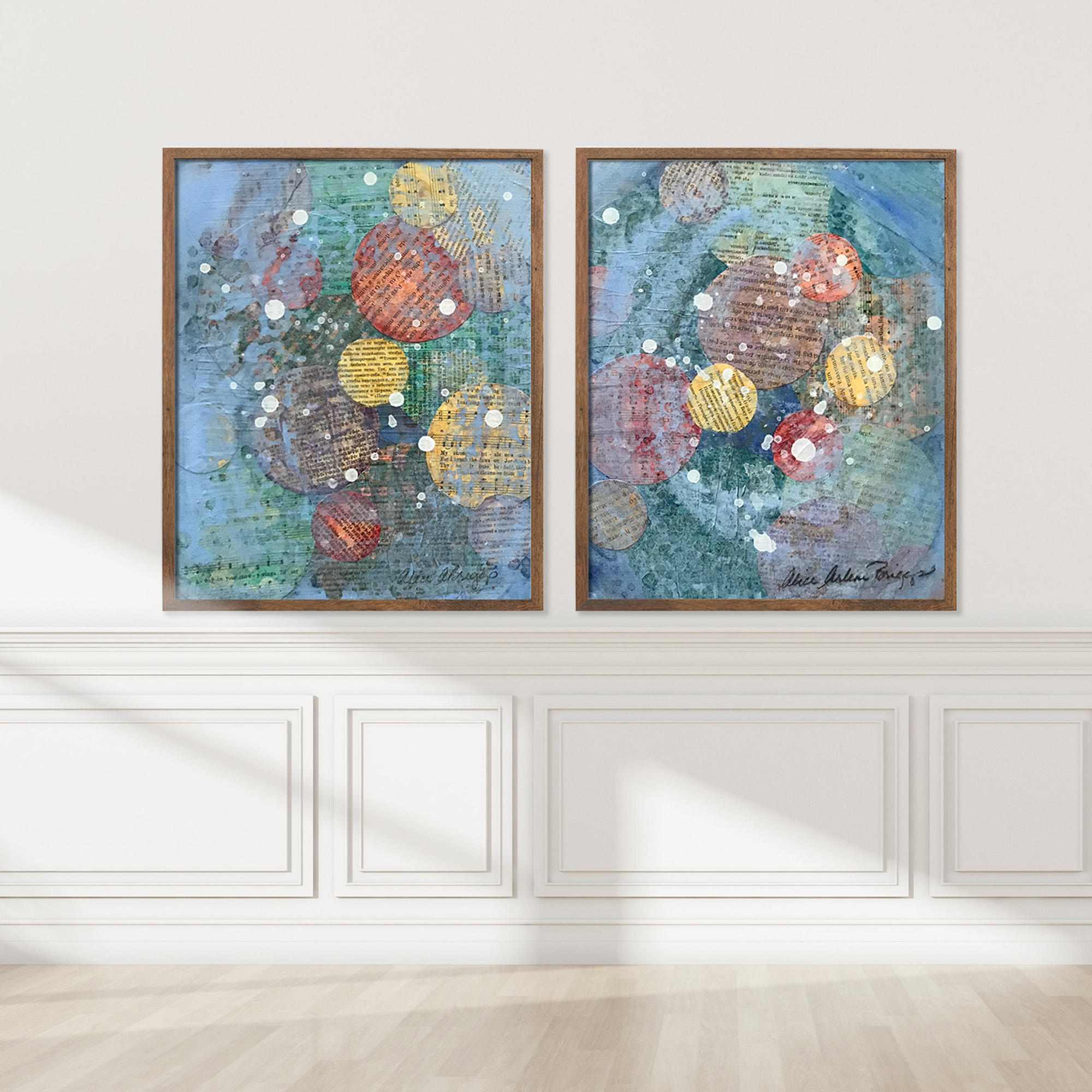 I was experimenting with multiple layers of collage materials cut into circles with the paint. I felt such joy and it persists every time I see two pieces. I hope they will bring you great joy as they hang in your space.