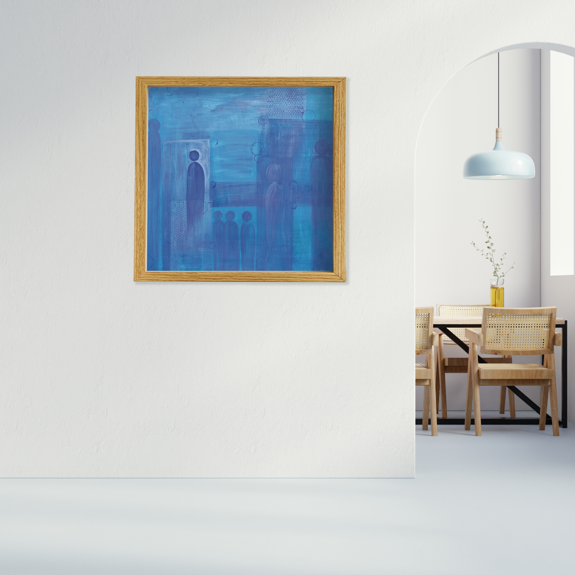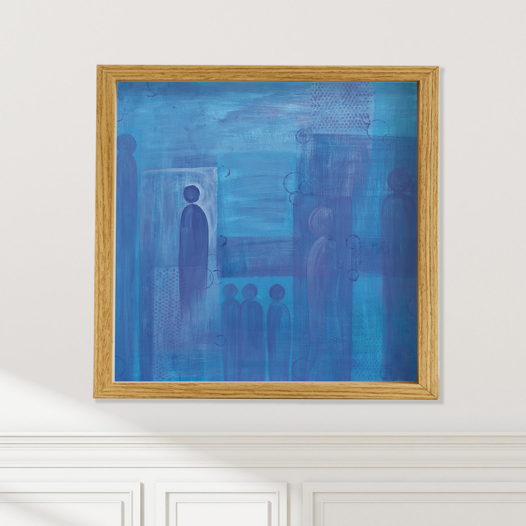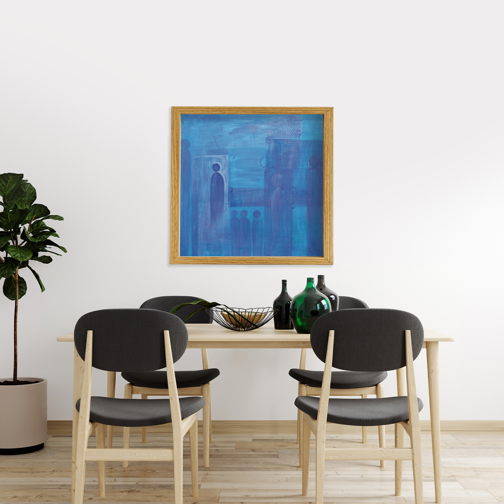 Frames are solid wood in four finishes: black oak, walnut stained oak, natural oak, and white oak. All four are clean, contemporary profiles that let the artwork lead. If you'd like to request another frame color or style, please reach out for a custom quote.