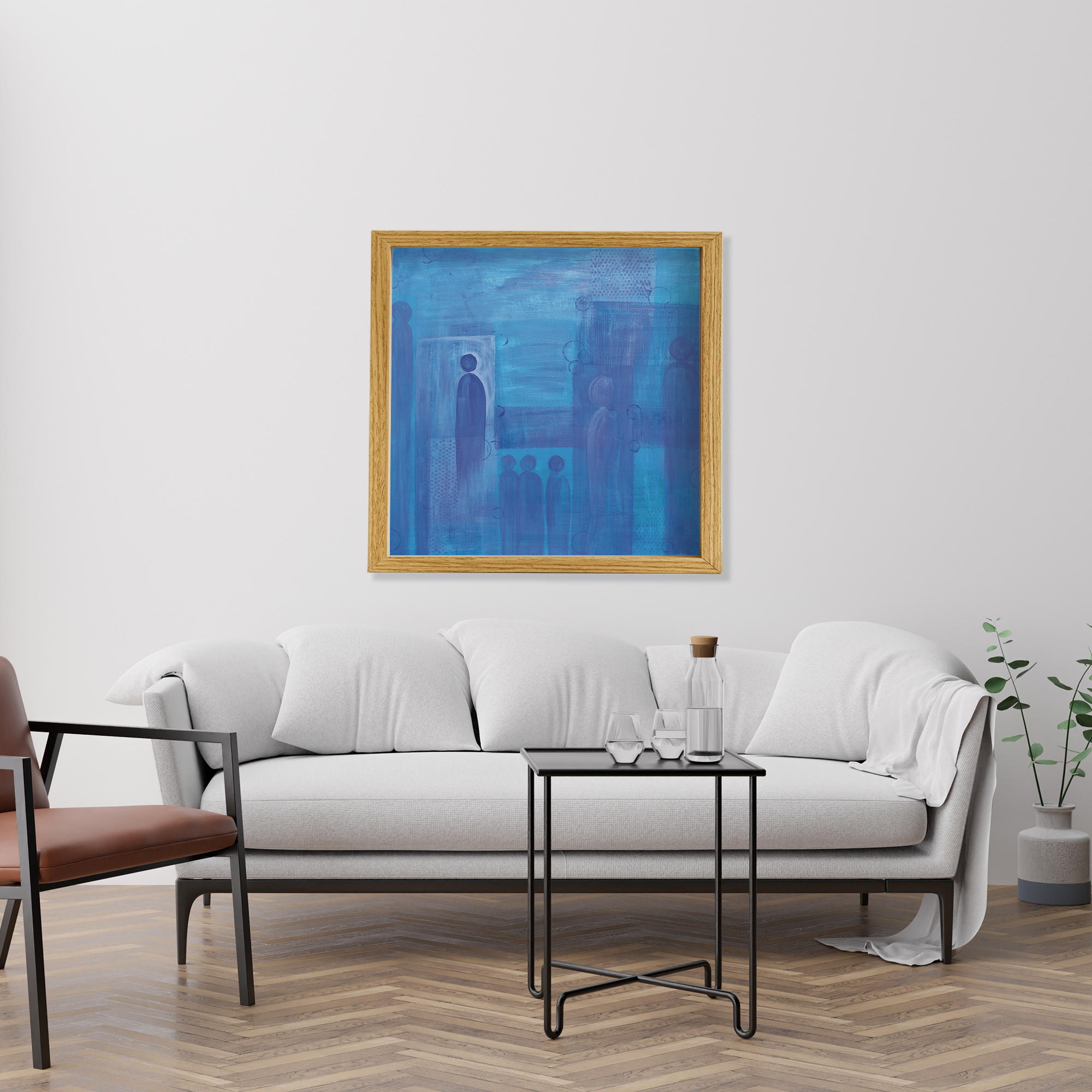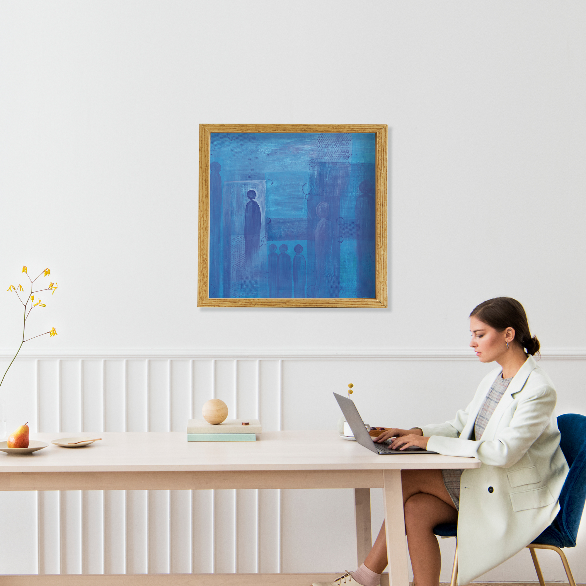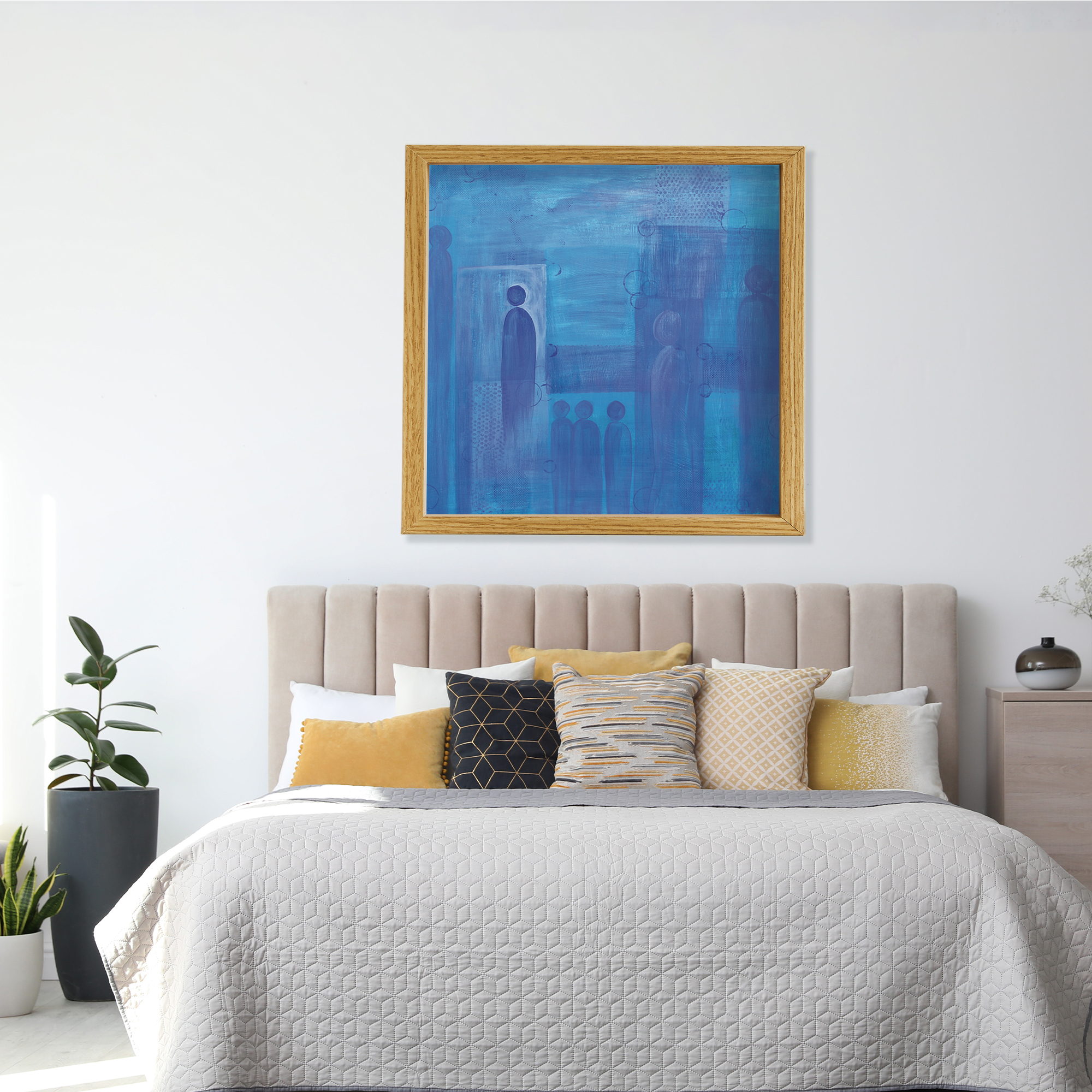 Frames are solid wood in four finishes: black oak, walnut stained oak, natural oak, and white oak. All four are clean, contemporary profiles that let the artwork lead. If you'd like to request another frame color or style, please reach out for a custom quote.