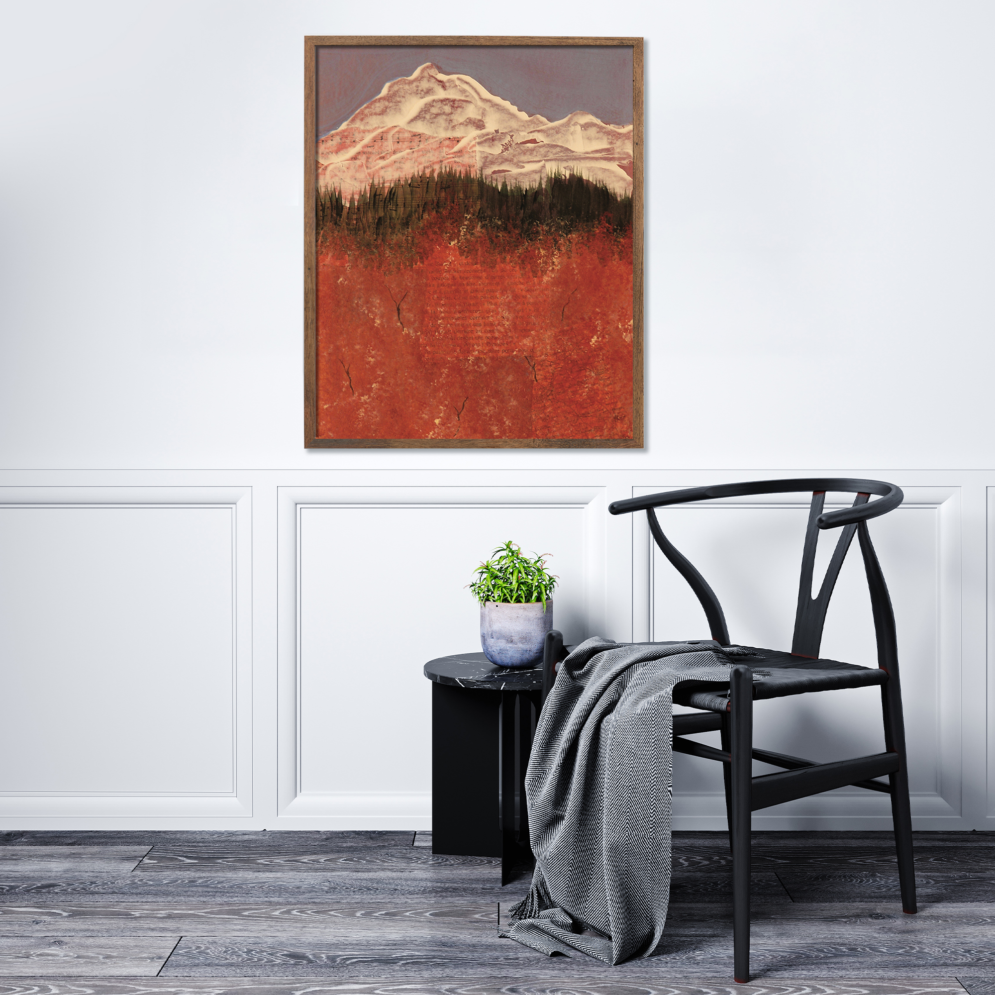 Frames are solid wood in four finishes: black oak, walnut stained oak, natural oak, and white oak. All four are clean, contemporary profiles that let the artwork lead. If you'd like to request another frame color or style, please reach out for a custom quote.