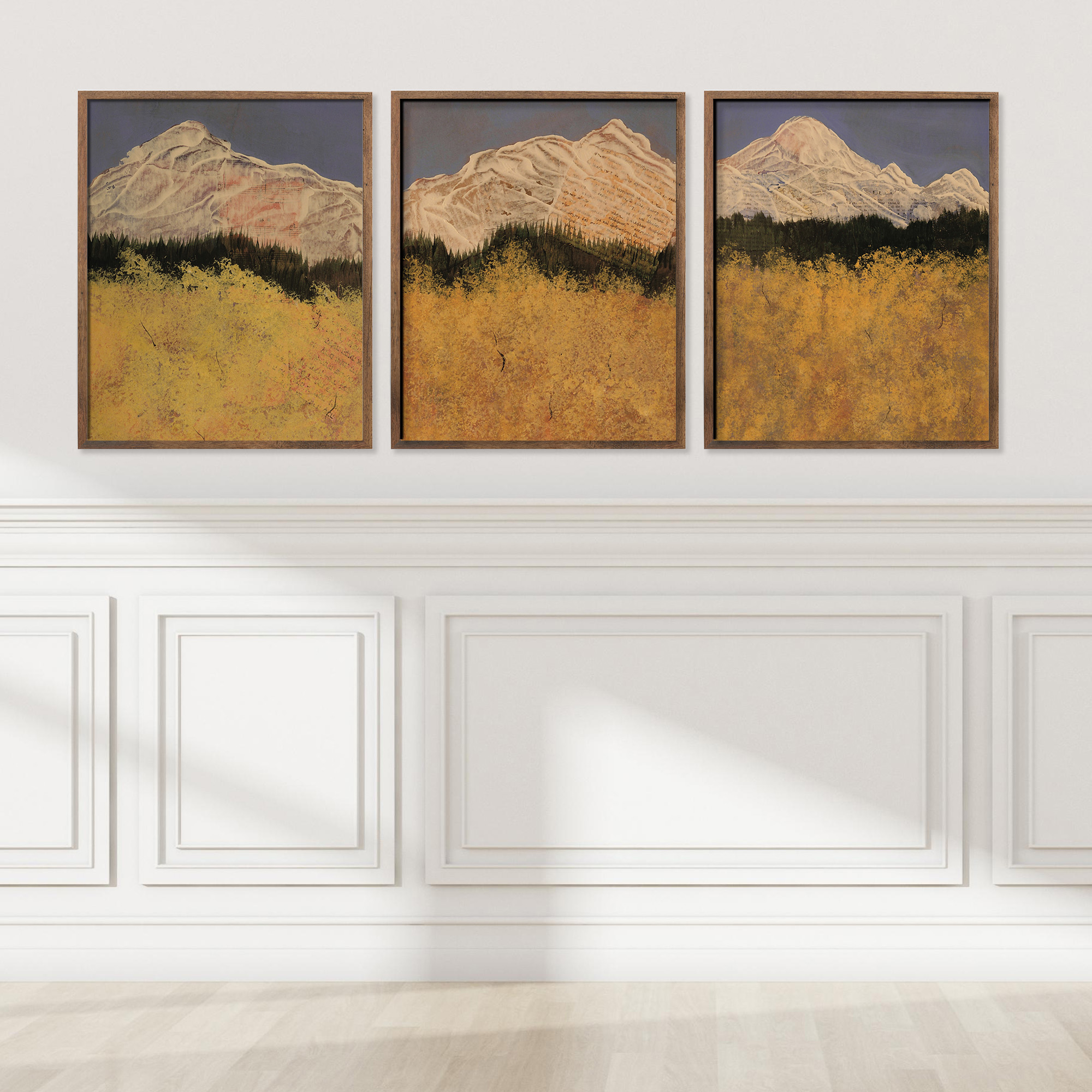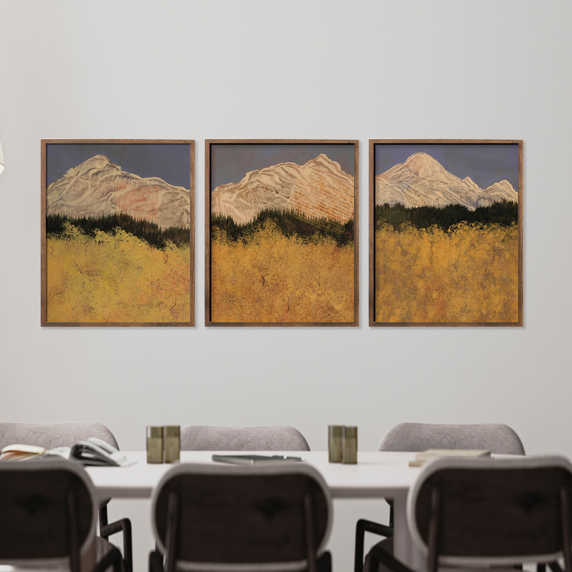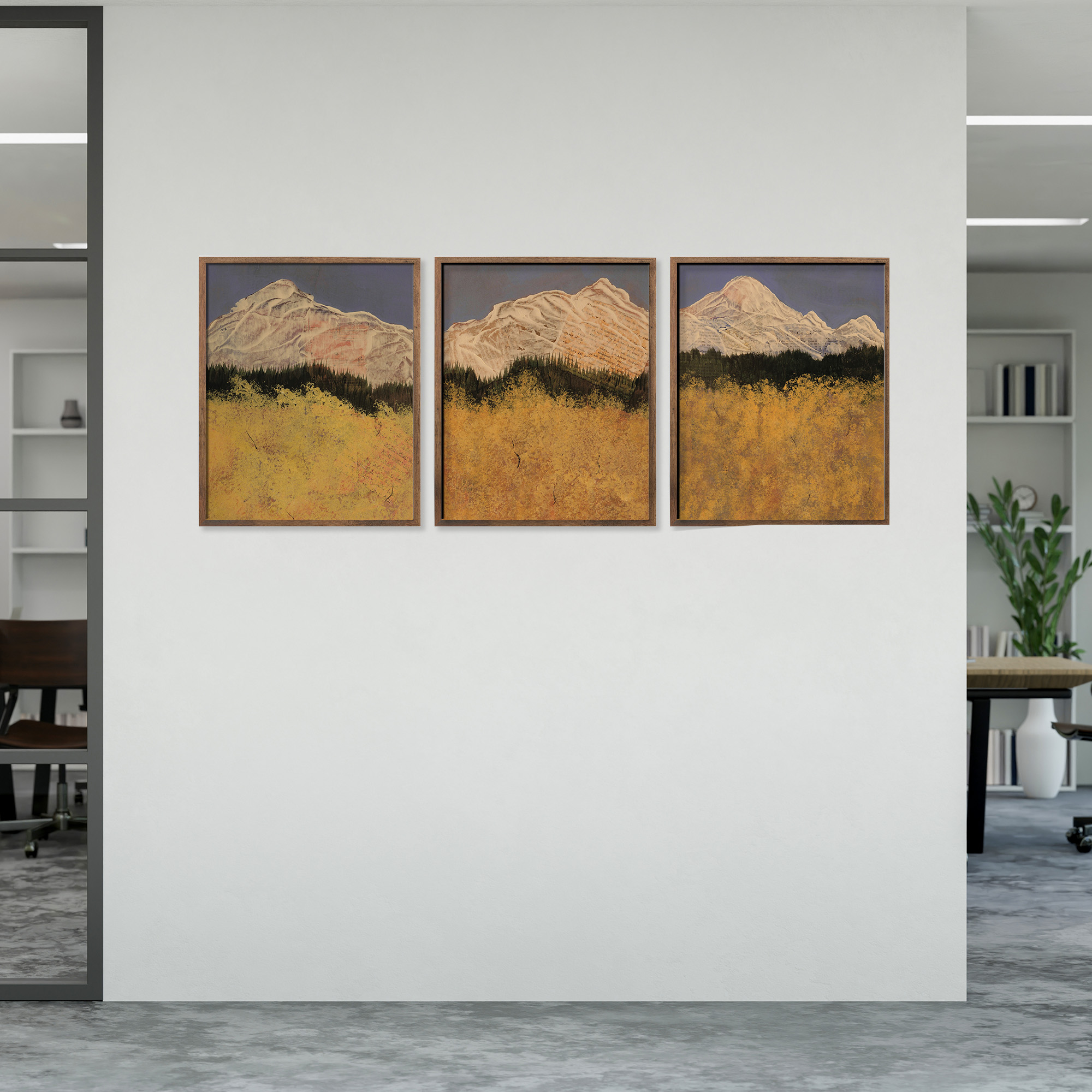 Stand among the aspens and look out to the mountains. This trio captures that joyful, peaceful moment — rich yellows glowing against blue sky and white peaks, from the artist’s travels in Colorado. Part of the Aspen series.