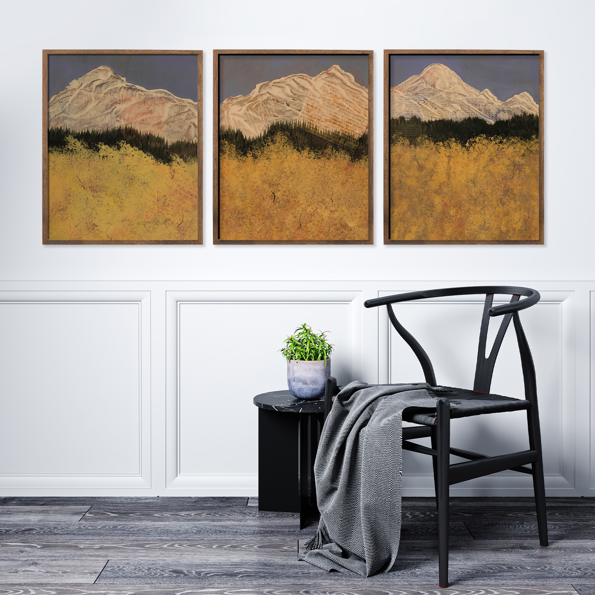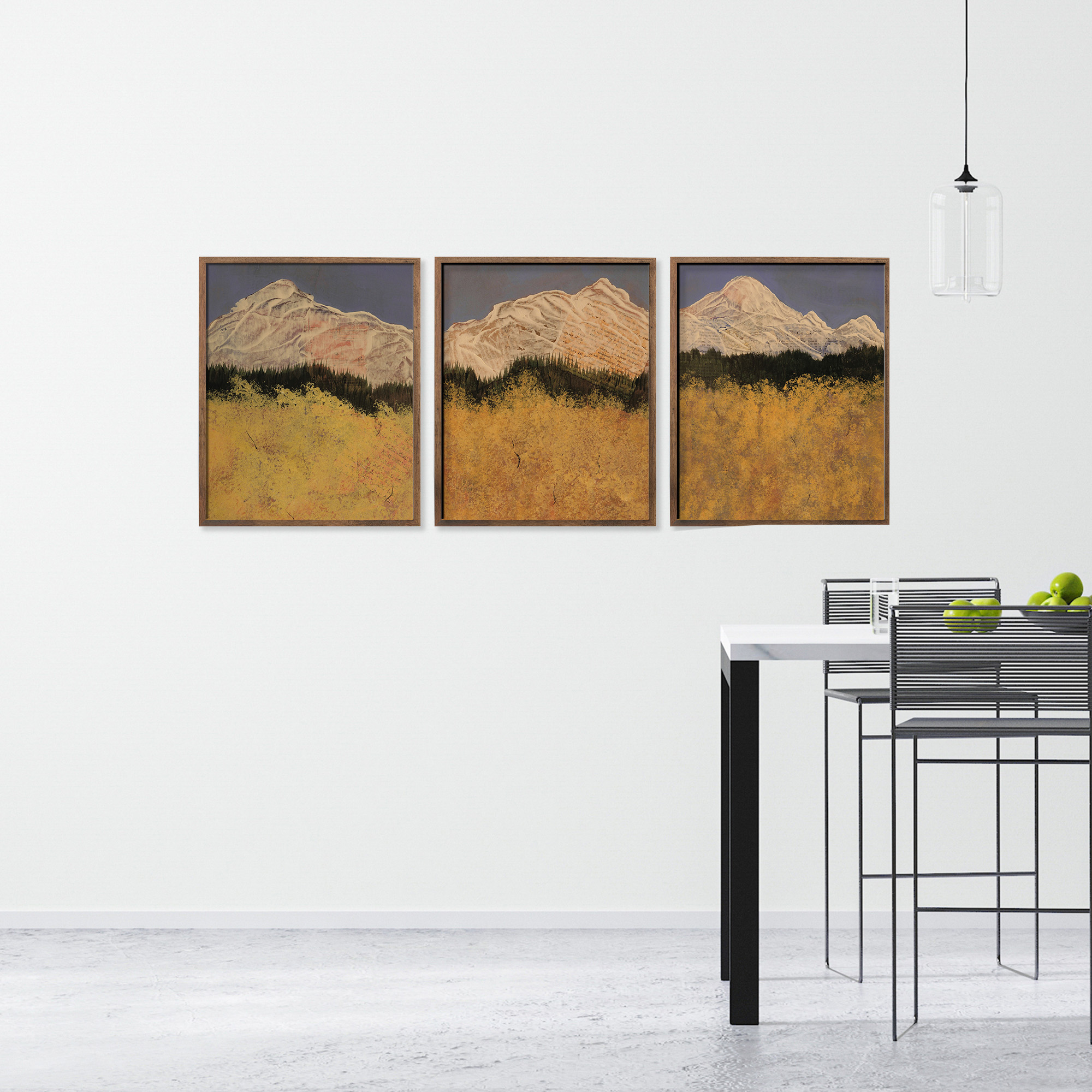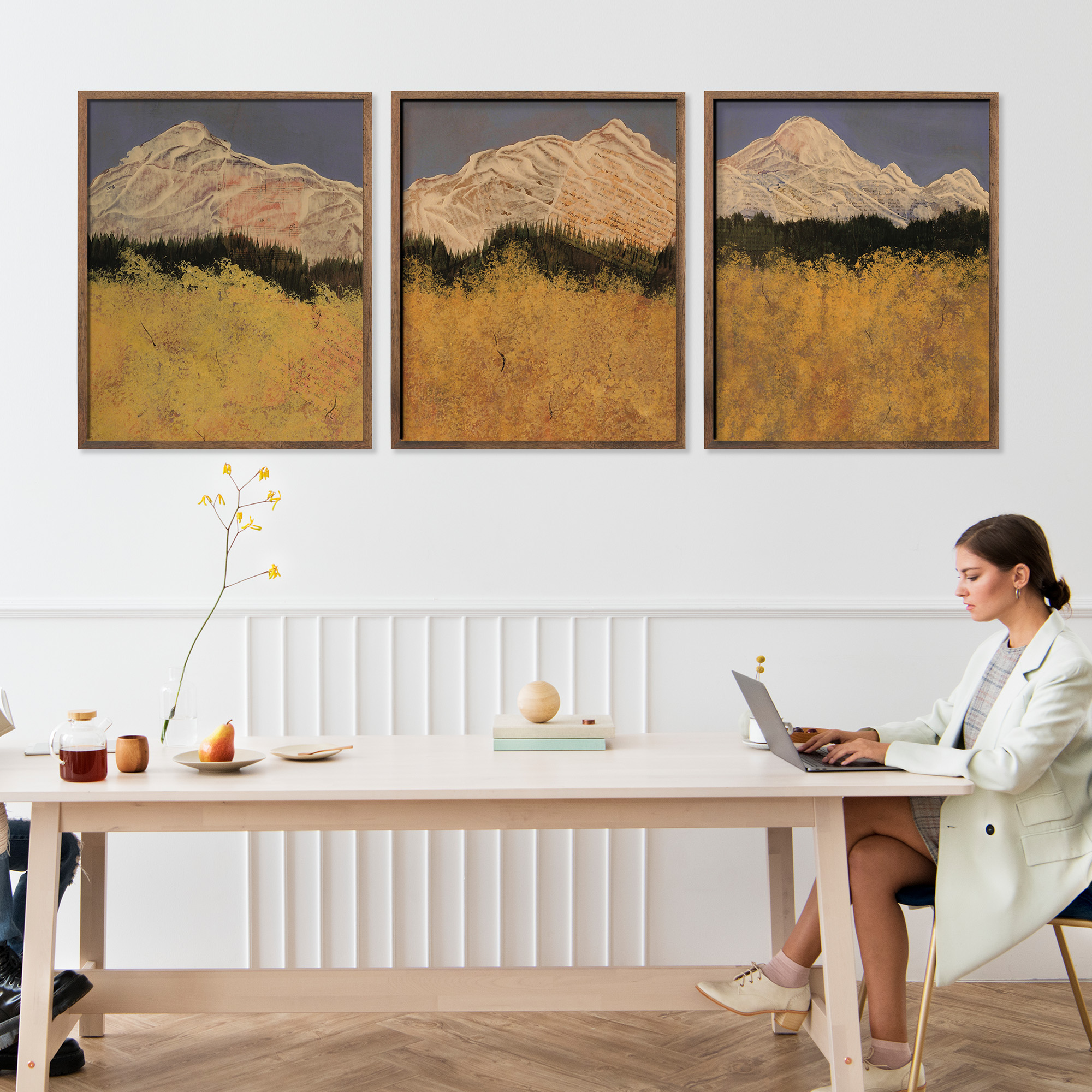 Stand among the aspens and look out to the mountains. This trio captures that joyful, peaceful moment — rich yellows glowing against blue sky and white peaks, from the artist’s travels in Colorado. Part of the Aspen series.