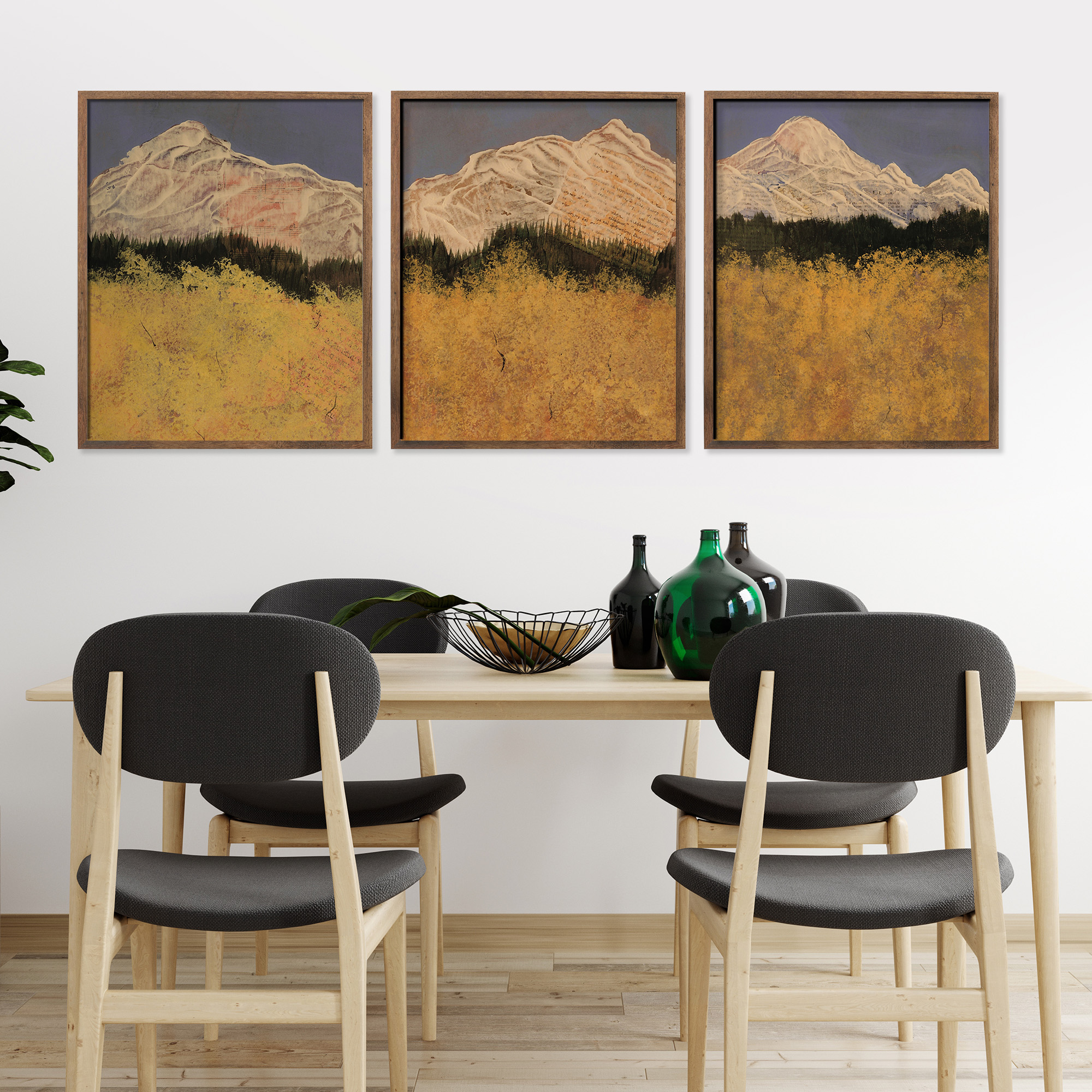 Frames are solid wood in four finishes: black oak, walnut stained oak, natural oak, and white oak. All four are clean, contemporary profiles that let the artwork lead. If you'd like to request another frame color or style, please reach out for a custom quote.