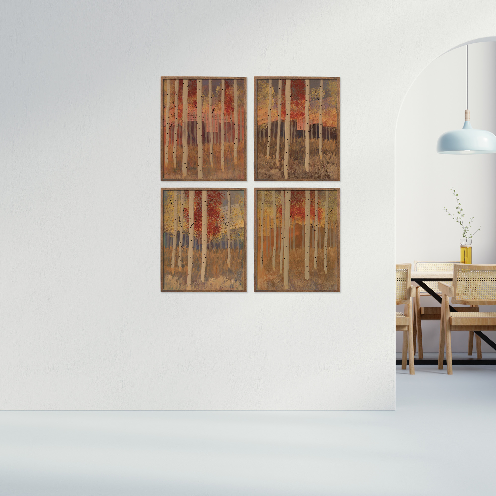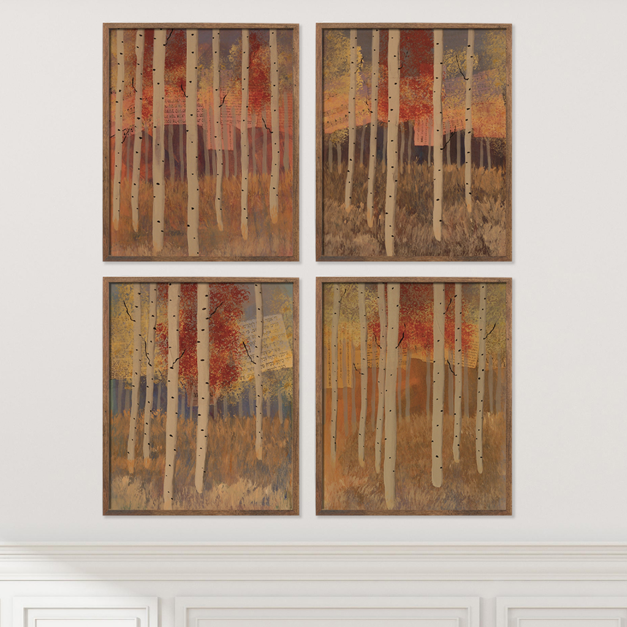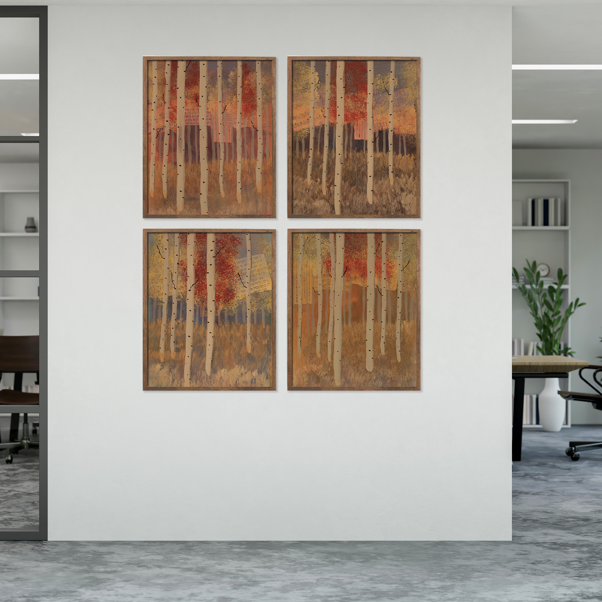 An aspen grove in full fall color, in four parts. From the artist’s own travels in Colorado — rich yellow and red, the light through the leaves, the quiet of the woods. Part of the Aspen series.