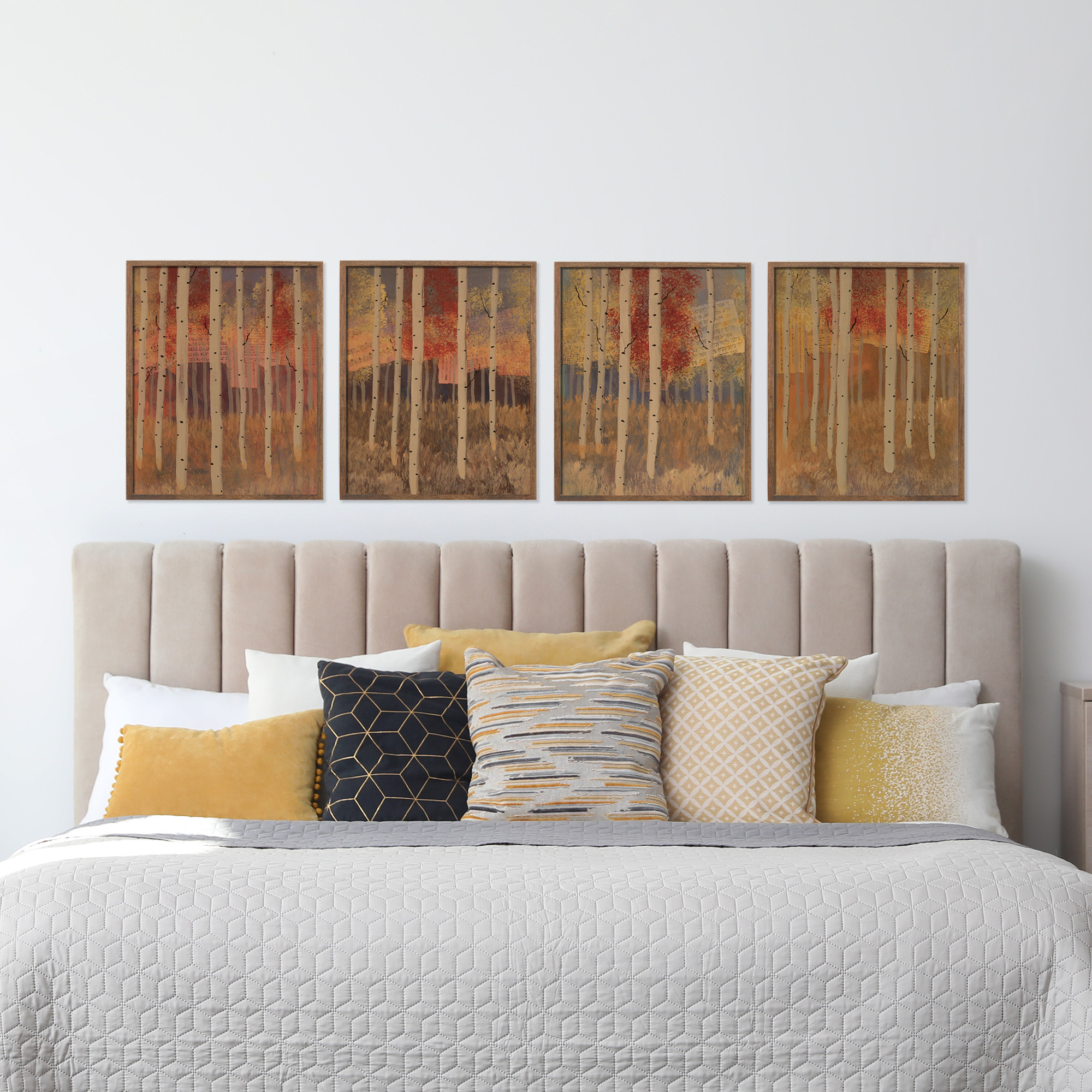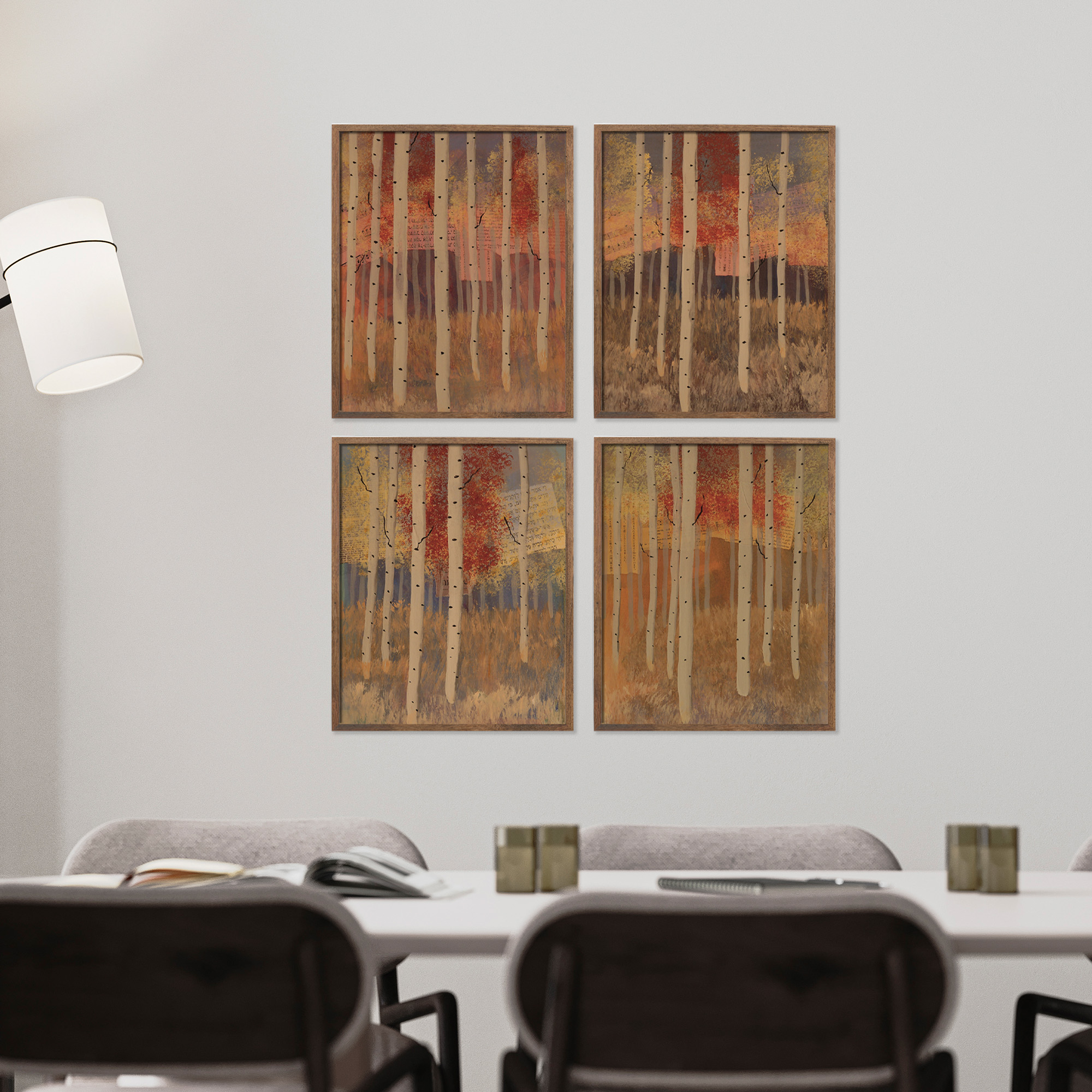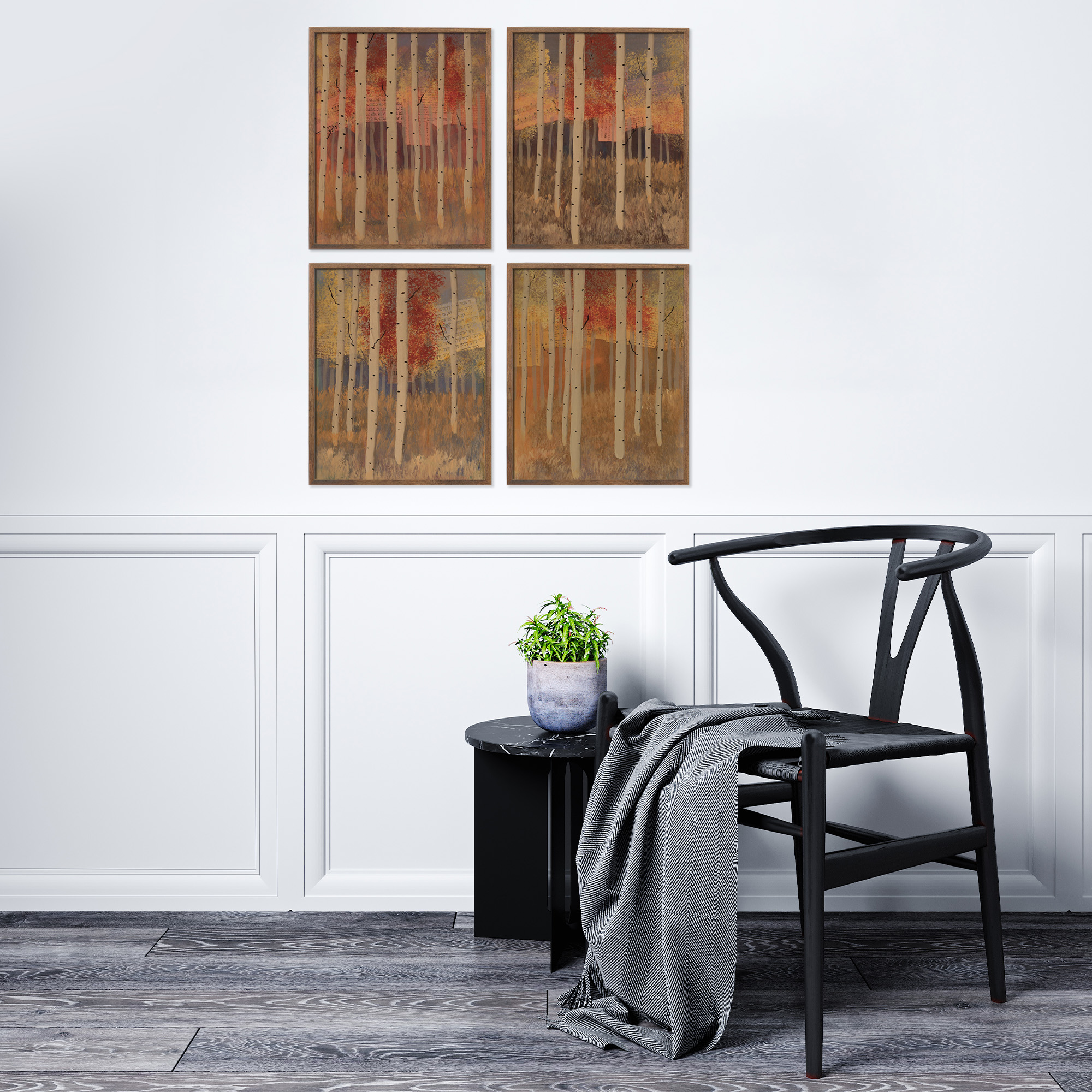 An aspen grove in full fall color, in four parts. From the artist’s own travels in Colorado — rich yellow and red, the light through the leaves, the quiet of the woods. Part of the Aspen series.