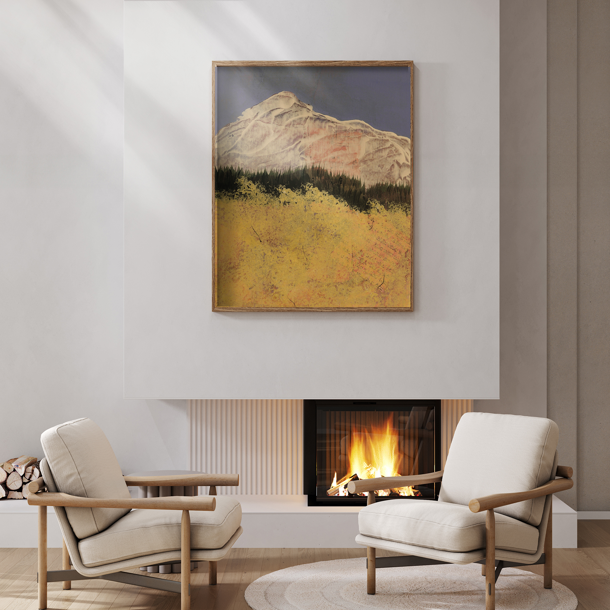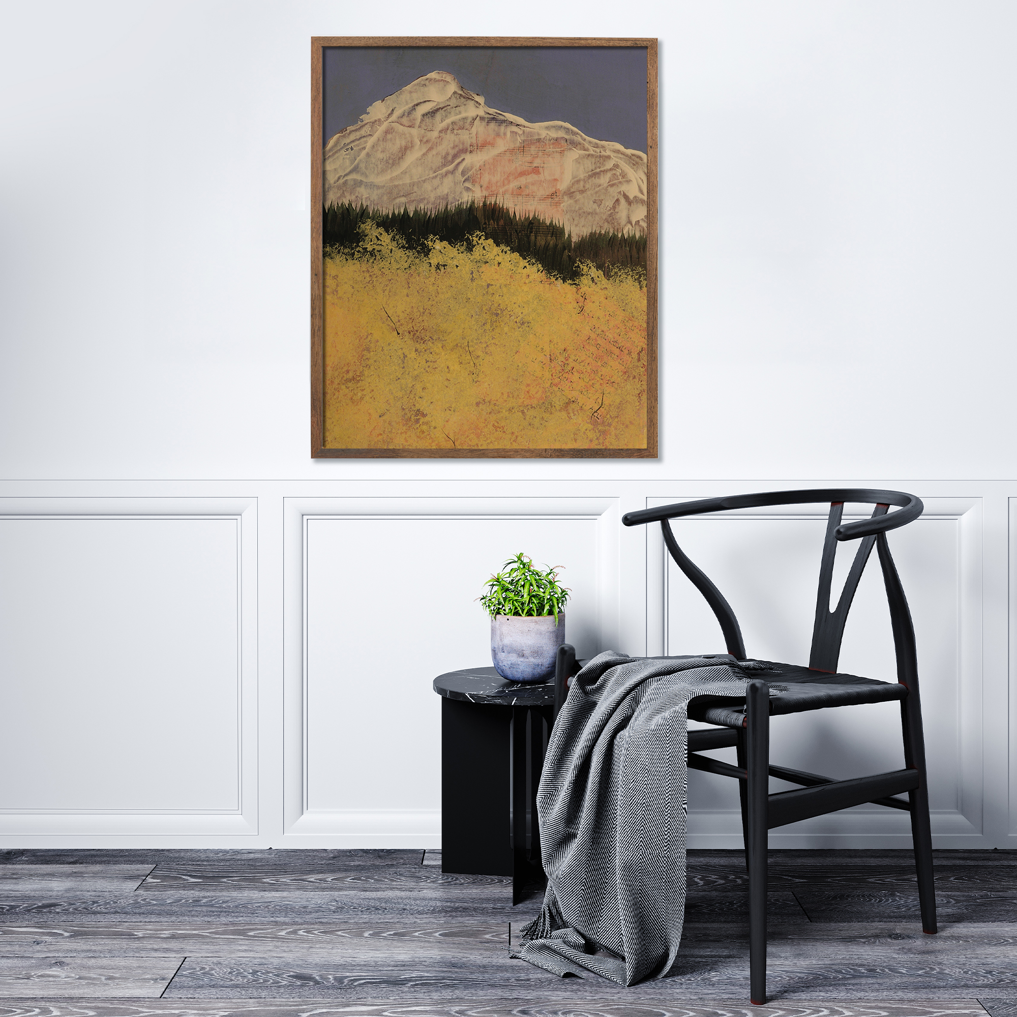 Frames are solid wood in four finishes: black oak, walnut stained oak, natural oak, and white oak. All four are clean, contemporary profiles that let the artwork lead. If you'd like to request another frame color or style, please reach out for a custom quote.