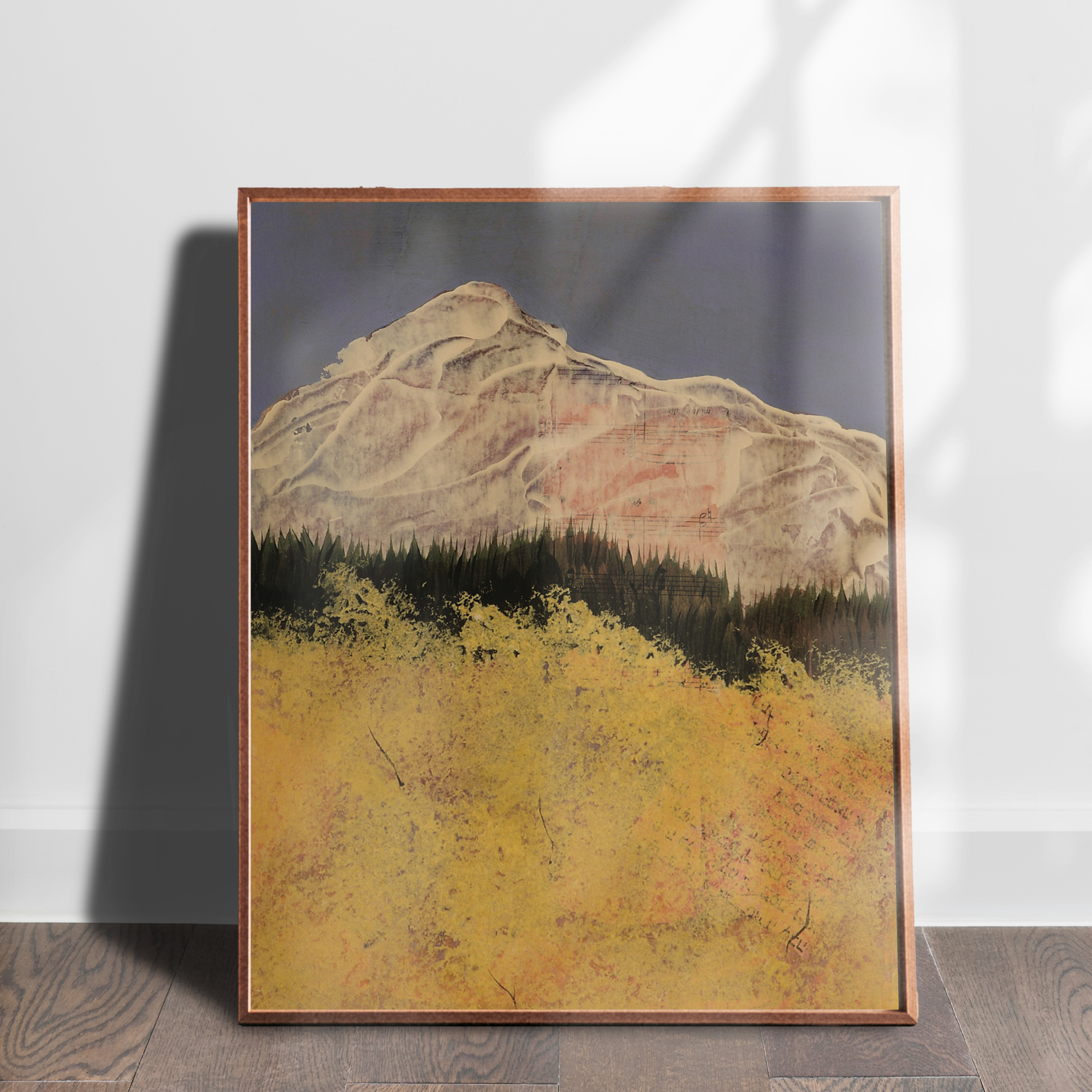 • Aspen Bridge mixed media abstracted landscape art print by Alice Arlene Briggs shown on the floor, rich yellows on archival cotton paper Aspen Bridge Price range: $39.00 through $310.00