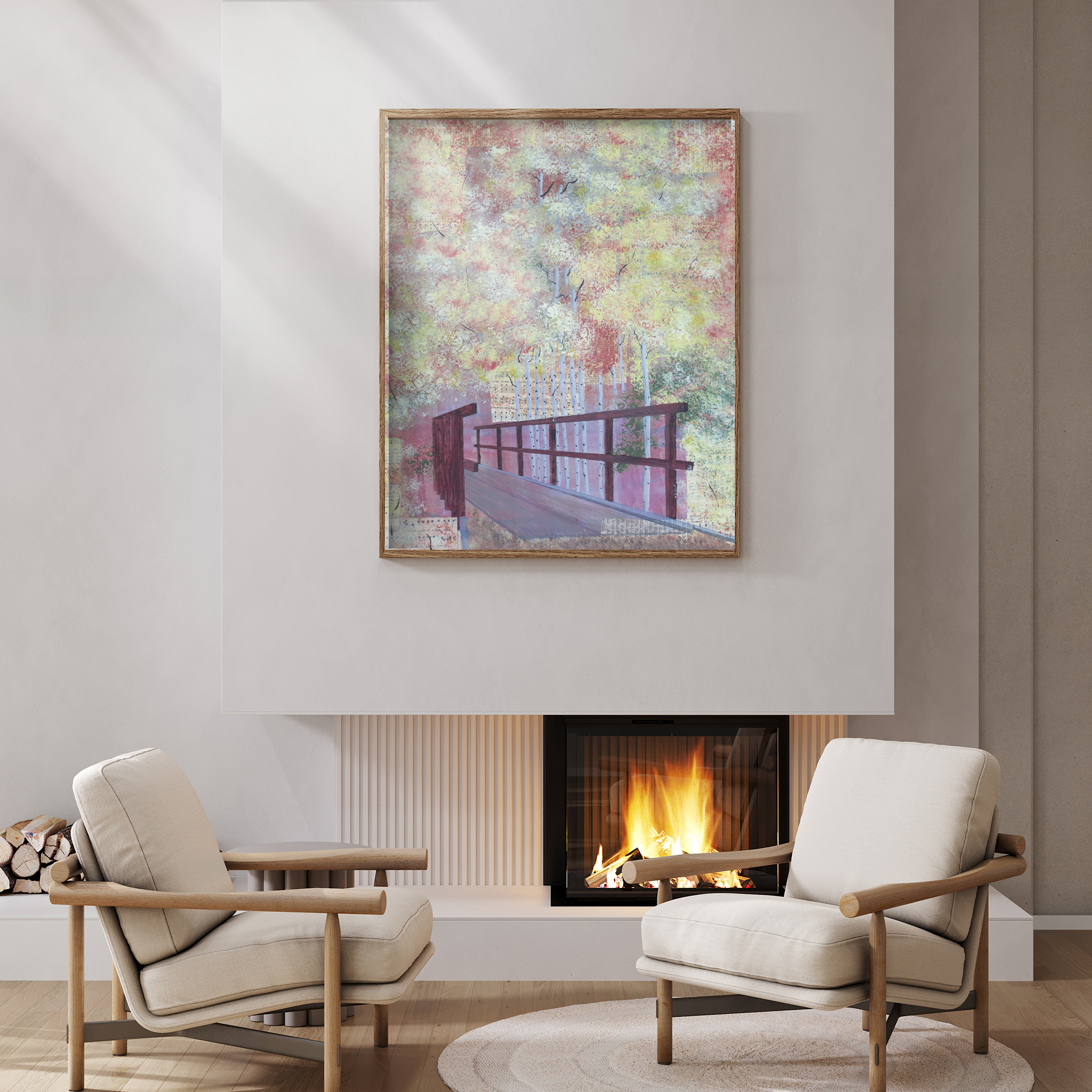 • Ringwood1 abstracted landscape art print on wall by Alice Arlene Briggs, peaceful fall forest trail in rose yellow and brown, available framed or unframed Ringwood1 Price range: $59.00 through $340.00