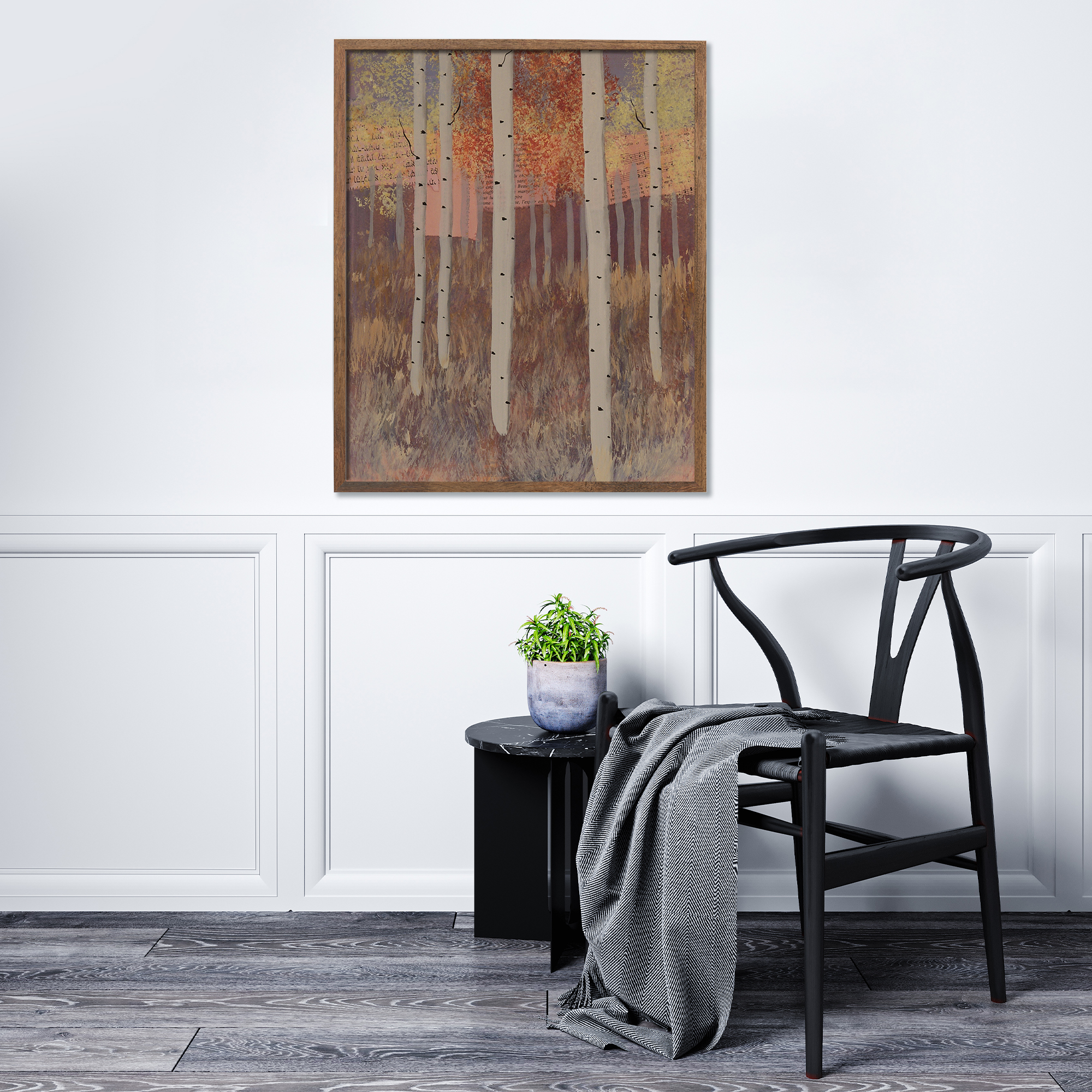 Frames are solid wood in four finishes: black oak, walnut stained oak, natural oak, and white oak. All four are clean, contemporary profiles that let the artwork lead. If you'd like to request another frame color or style, please reach out for a custom quote.