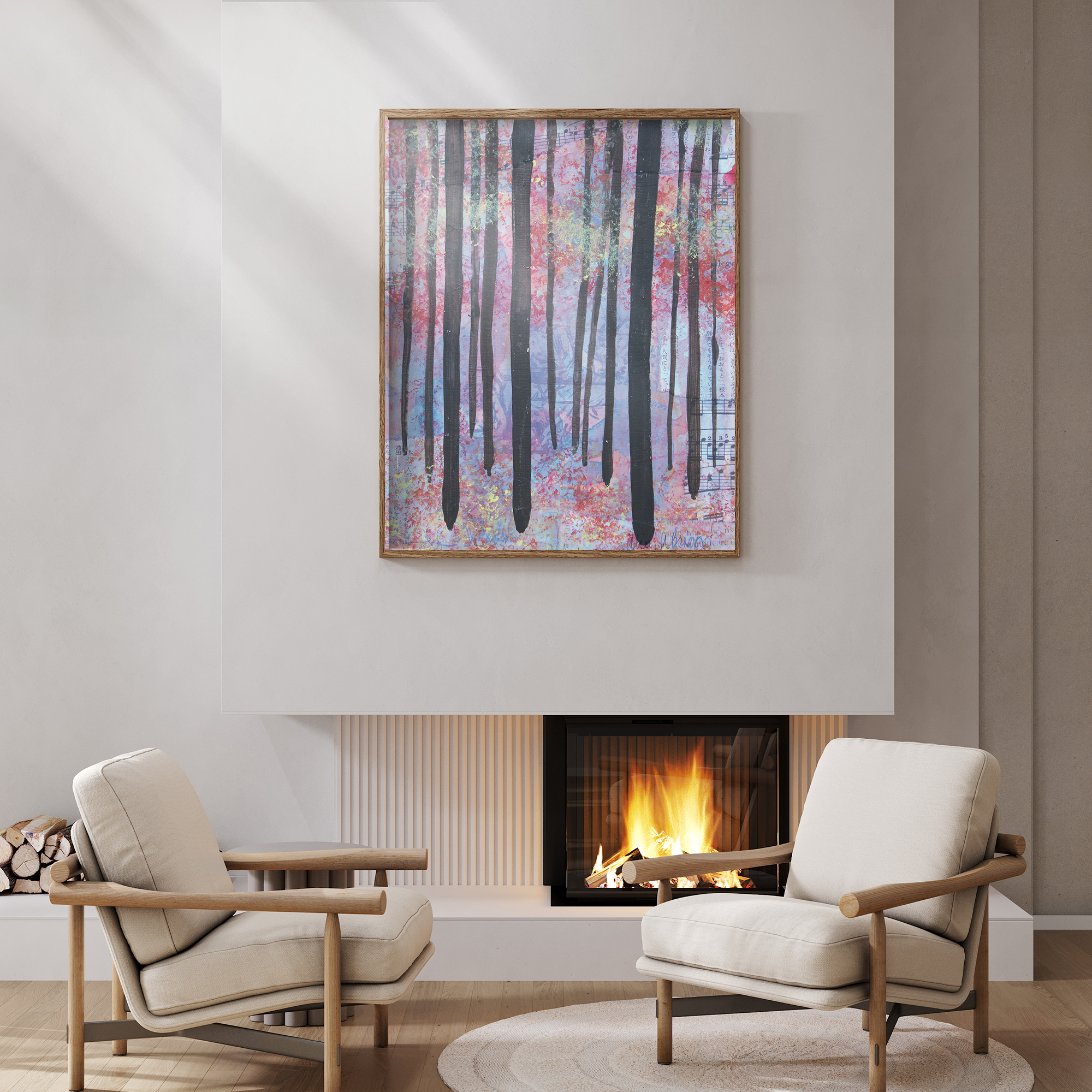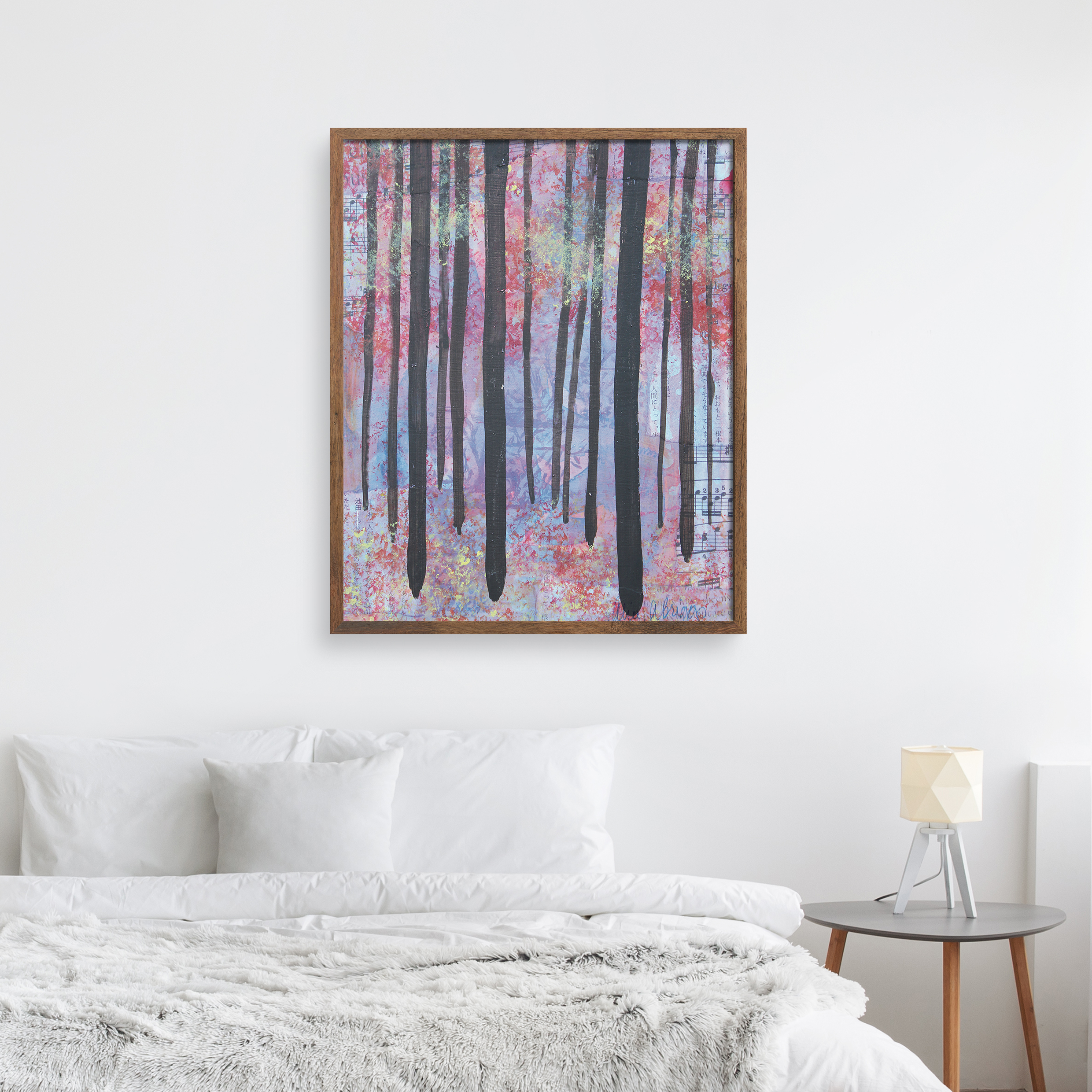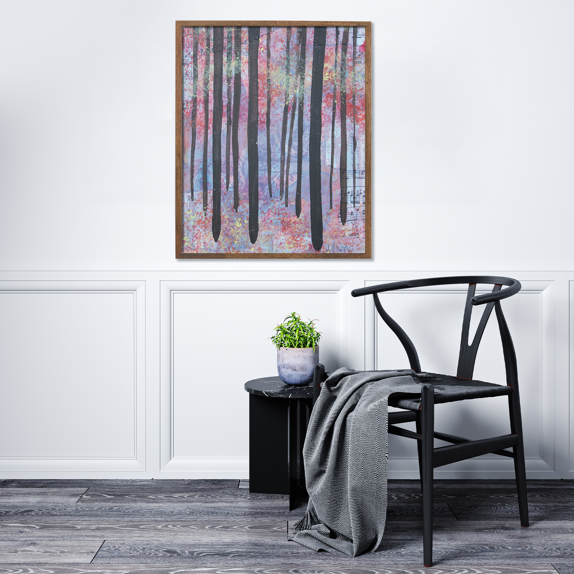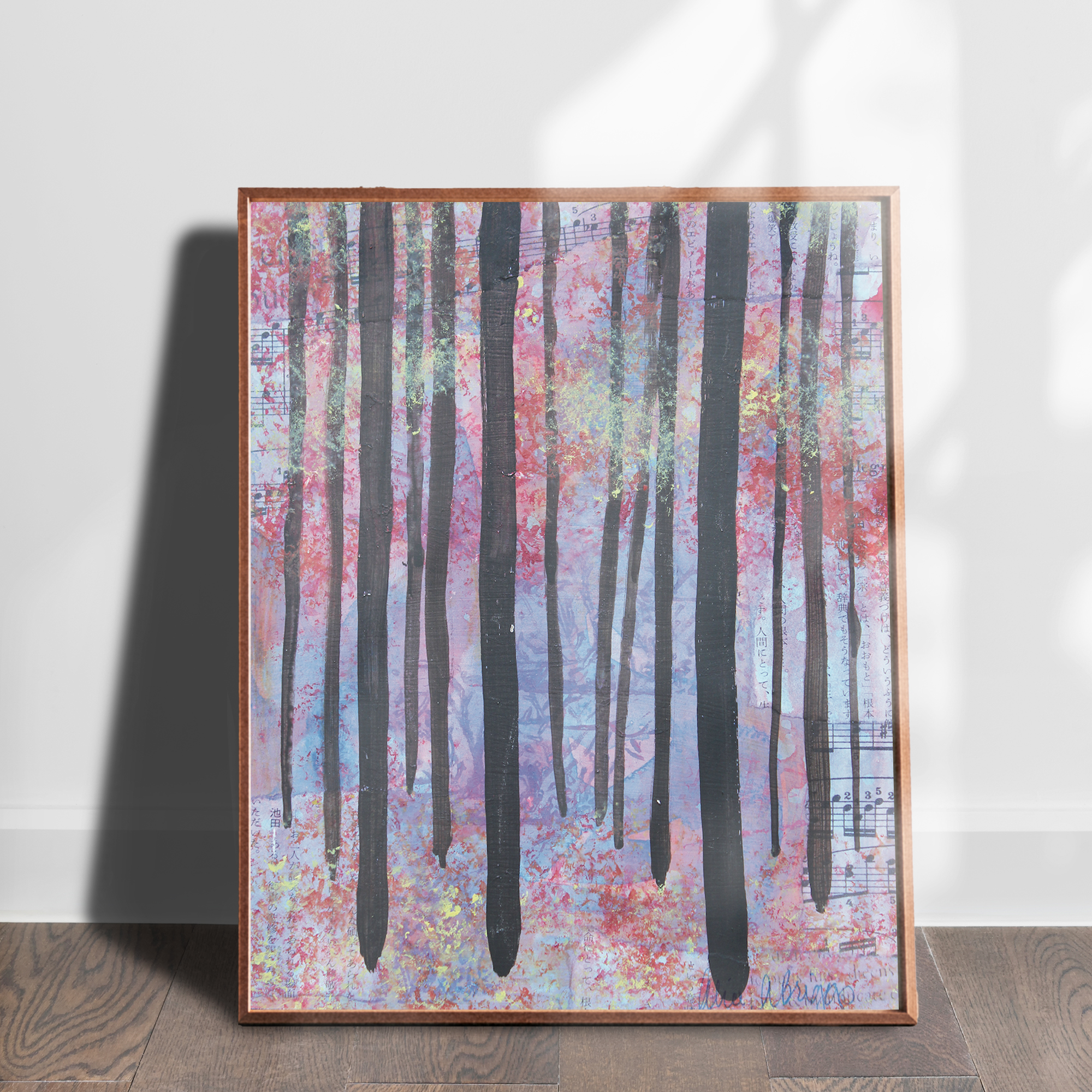 • Trees 2 mixed media abstracted landscape art print by Alice Arlene Briggs shown on the floor, rich purple on archival cotton paper Trees 2 Price range: $39.00 through $310.00